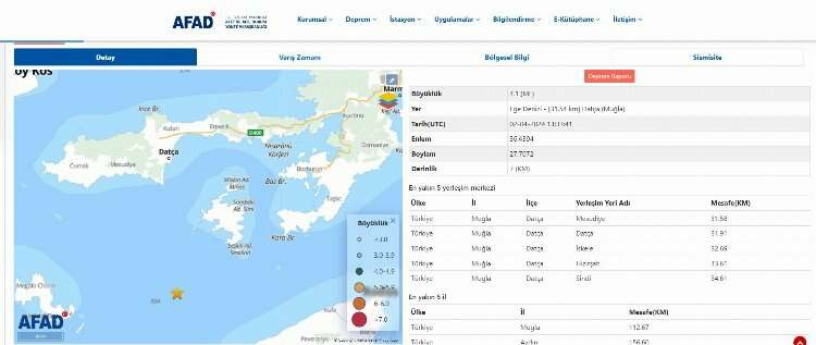Afet ve Acil Durum Yönetimi Başkanlığı (AFAD) tarafından yapılan bilgilendirmede, merkez üssü Datça ilçesine 31.54 kilometre uzaklıktaki Ege Denizi'nde saat 16.33'te yerin 7 kilometre derinliğinde 4.1 büyüklüğünde deprem meydana geldi. Deprem sonrası depremin merkez üssünde ve çevresinde herhangi bir can ve mal kaybının olmadığı öğrenildi.