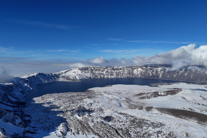 Bitlis’in Ahlat, Güroymak ve Tatvan ilçe sınırları içinde bulunan Nemrut Dağı’nda yer alan krater gölü, karla kaplanan dağ manzarasıyla etkileyici bir görüntü sunuyor.