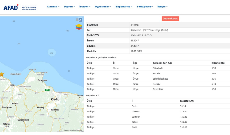 Afet ve Acil Durum Yönetimi Başkanlığı (AFAD), merkez üssü Ordu'nun Ünye ilçesi olan 3.4 büyüklüğünde bir deprem meydana geldiğini duyurdu.