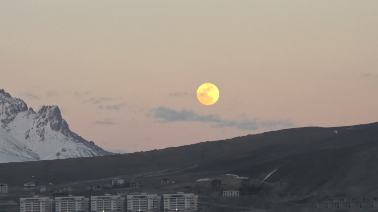 Van'da baharın habercisi olarak bilinen 'pembe dolunay', akşam saatlerinde Erek Dağı'nın zirvesinden yükselerek muhteşem manzarasıyla izleyenlere görsel şölen sundu. Kent genelinde açık ve sakin havanın etkili olmasıyla birlikte gökyüzünde beliren dolunay, kısa sürede vatandaşların ilgisini çekti.