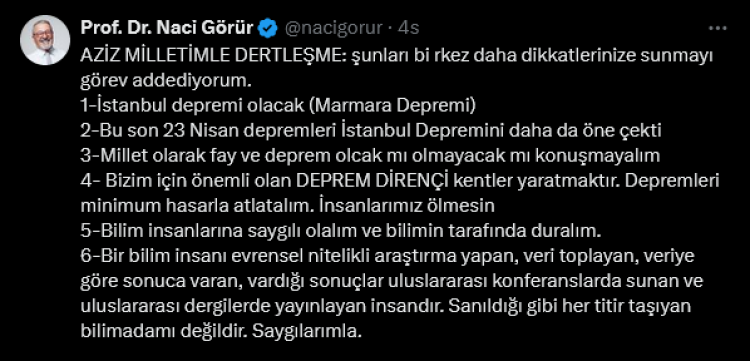 Deprem uzmanı Prof. Dr. Naci Görür, sosyal medya hesabından yaptığı paylaşımda, İstanbul’un beklenen Marmara Depremi’ne dikkati çekti.