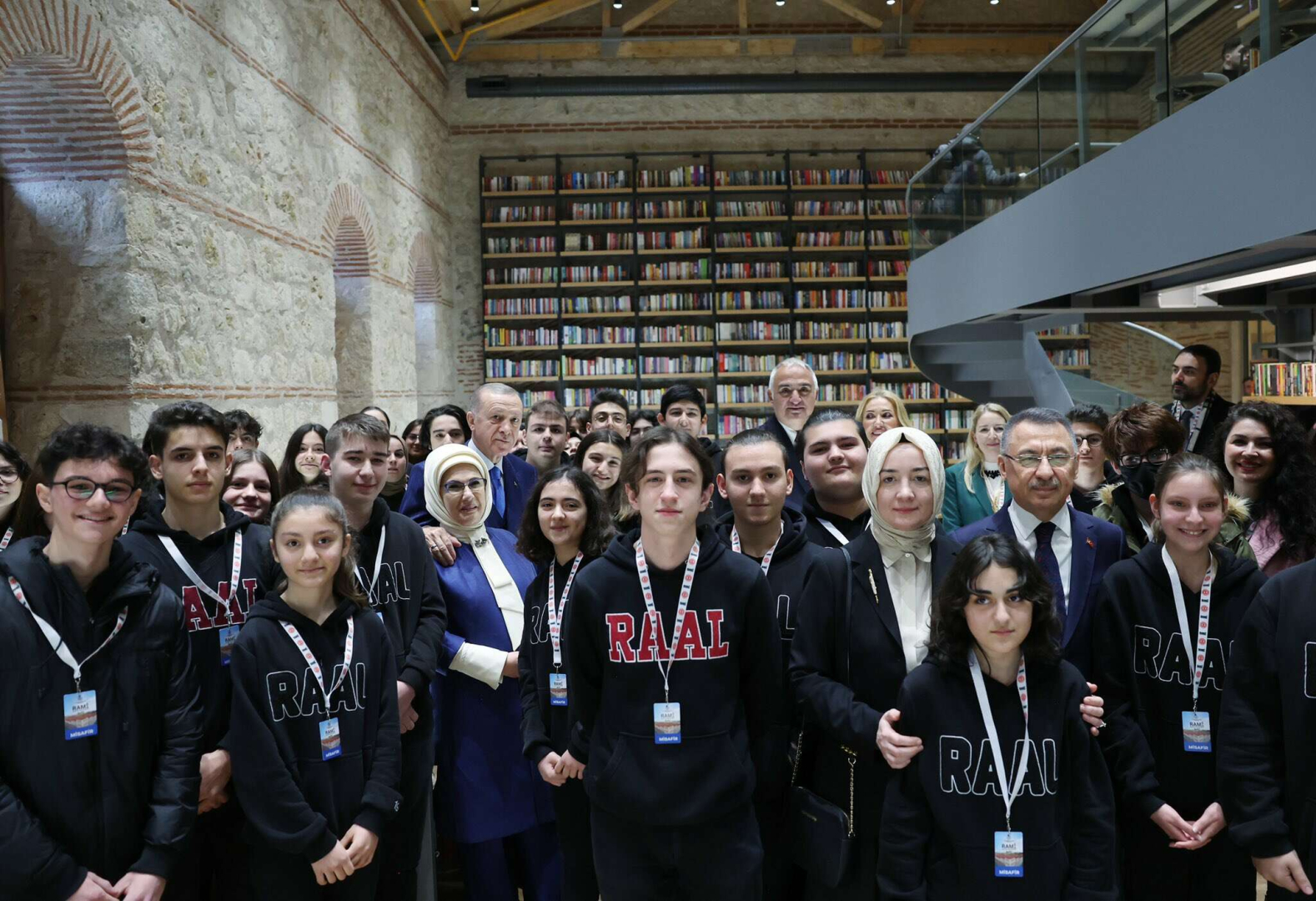 Gençlerle bir arada olduğunu kaydeden Cumhurbaşkanı Erdoğan, “'Cumhurbaşkanım 5 dakikada okuldan buraya geliyoruz' dediler. Burada 'çayınızı, kahvenizi, çorbanızı içecek misiniz' İçeceksiniz, para yok. Yarın sabahtan itibaren bu uygulama da başlıyor. Şöyle geriye doğru baktığımızda kütüphanelerimiz ne kadar zengin, ne kadar yaygın, ne kadar hareketli ise medeniyetimiz o derece güçlü milletimiz o derece müreffeh olmuştur. Bizim medeniyetimiz kitapla, defterle, kalemle, mürekkeple, okumakla, anlamakla, sormakla, anlatmakla yoğrulmuş, ilimle, irfanla, hikmetle kıvamını bulmuştur. Duvarları kitaplarla dolu bir kütüphaneyi en kıymetli hazinelerden daha üstün tutan ecdadımız her kütüphaneyi cennetten bir köşke benzetmiştir. Ecdat onların eserlerini de bu ağaçların meyveleri olarak görmüştür. İnşallah biz de onlara layık oluruz” dedi.