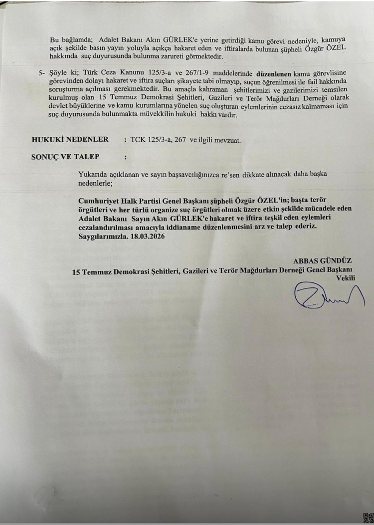 CHP Genel Başkanı Özgür Özel'in Adalet Bakanı Akın Gürlek'i hedef alan açıklamalarının ardından harekete geçen şehit yakınları ve gaziler adına suç duyurusunu Terör Gazisi, 15 Temmuz Demokrasi Şehitleri, Gazileri ve Terör Mağdurları Derneği Genel Başkanı Abbas Gündüz yaptı. Gündüz, Ankara Cumhuriyet Başsavcılığına yaptığı suç duyurusunda CHP Genel Başkanı Özgür Özel'in 'Kamu görevlisine karşı alenen hakaret (TCK125/3-a) ve iftira suçları (TCK267/1-9)ile resen tespit edilecek diğer suçlar' kapsamında yargılanmasını talep etti.