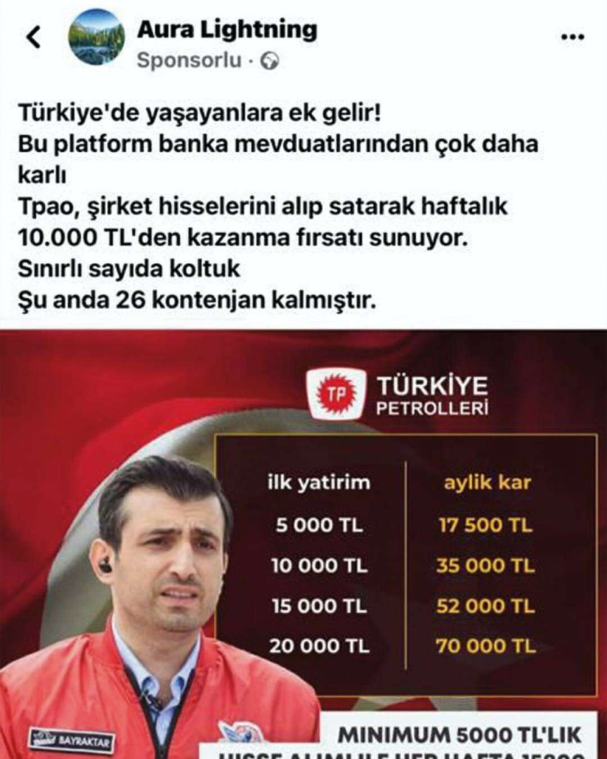 Baykar’dan yapılan açıklamada, “Bir süredir sosyal medya mecraları ve bazı internet sitelerinde Türkiye Petrolleri Anonim Ortaklığı'nın (TPAO) adı ve Baykar Yönetim Kurulu Başkanı Selçuk Bayraktar'ın fotoğrafları kullanılarak 'yatırım fırsatı', 'ek gelir' gibi başlıklarla yayınlanan ilanlar açık bir dolandırıcılık girişimidir. Yürütülen bu girişimin dolandırıcılık faaliyeti olduğu TPAO tarafından da duyurulmuştur. Bahse konu bu dolandırıcılık faaliyetine karşı tarafımızdan gerekli hukuki süreç başlatılmış olup, vatandaşlarımızın zarar görmemesi için bu ve benzeri dolandırıcılık faaliyetlerine itibar edilmemesini önemle rica ederiz” denild.