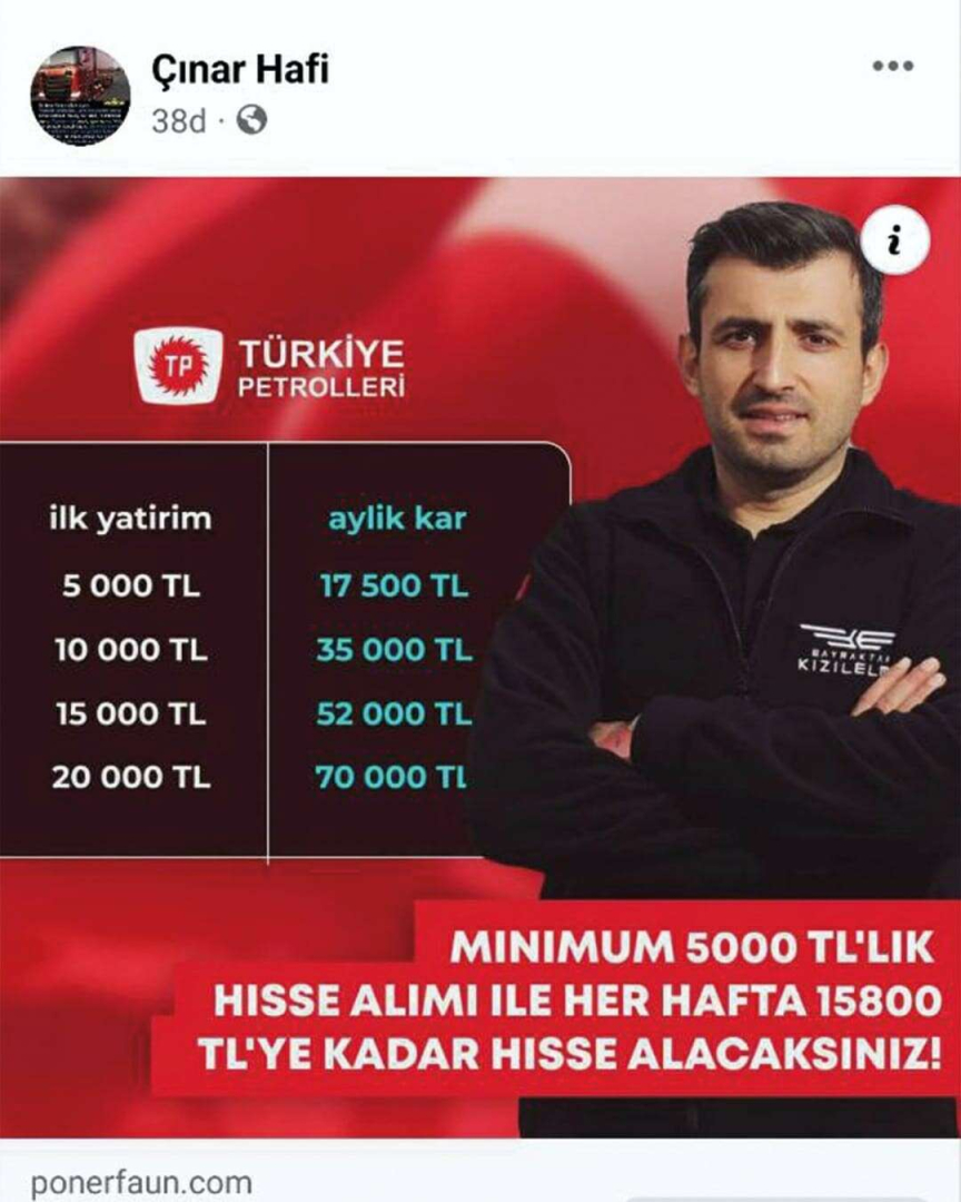 Baykar Yönetim Kurulu Başkanı Selçuk Bayraktar’ın fotoğrafı kullanılarak yapılan ilanlara ilişkin Baykar’dan yapılan açıklamada, "'Yatırım fırsatı', 'ek gelir' gibi başlıklarla yayınlanan ilanlar açık bir dolandırıcılık girişimidir" denildi.