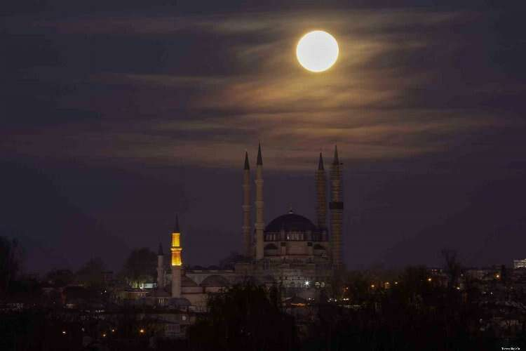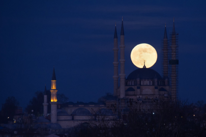 Edirne’de gökyüzünden beliren yılın son dolunayı ile Selimiye Camii’nin görüntüsü görsel şölen sundu.