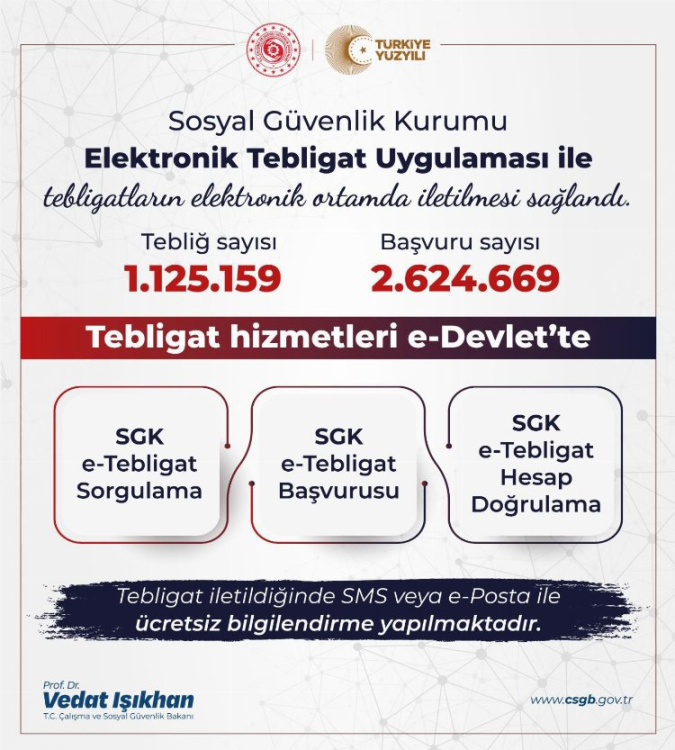 Çalışma ve Sosyal Güvenlik Bakanı Prof. Dr. Vedat Işıkhan, SGK'nın Elektronik Tebligat Uygulaması ile bugüne kadar 1 milyon 125 bin 159 tebligat yapıldığını açıkladı.