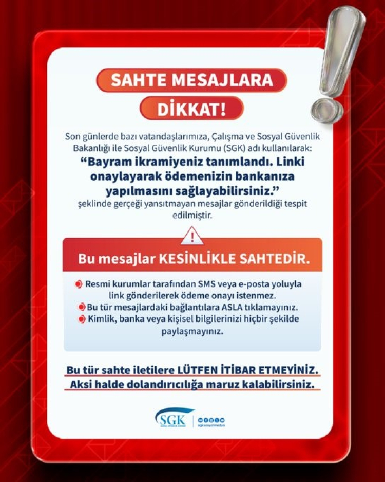 SGK, sosyal medya hesabından yaptığı paylaşımda, bu tür mesajlara asla tıklanmaması gerektiğini belirterek, "Sahte mesajlara dikkat. Son günlerde bazı vatandaşlarımıza, Çalışma ve Sosyal Güvenlik Bakanlığı ile SGK adı kullanılarak, ‘Bayram ikramiyeniz tanımlandı. Linki onaylayarak ödemenizin bankanıza yapılmasını sağlayabilirsiniz’ şeklinde gerçeği yansıtmayan mesajlar gönderildiği tespit edilmiştir. Bu mesajlar kesinlikle sahtedir. Resmi kurumlar tarafından SMS veya e-posta yoluyla link gönderilerek ödeme onayı istenmez. Bu tür mesajlardaki bağlantılara asla tıklamayınız. Kimlik, banka veya kişisel bilgilerinizi hiçbir şekilde paylaşmayınız. Bu tür sahte iletilere lütfen itibar etmeyiniz. Aksi halde dolandırıcılığa maruz kalabilirsiniz. Şüpheli durumlarda: Alo 170 Çalışma Hayatı İletişim Merkezi’ni arayabilirsiniz. CİMER üzerinden başvuru yapabilirsiniz. SGK il müdürlükleri/merkezlerine şahsen başvurabilirsiniz" ifadelerine yer verdi