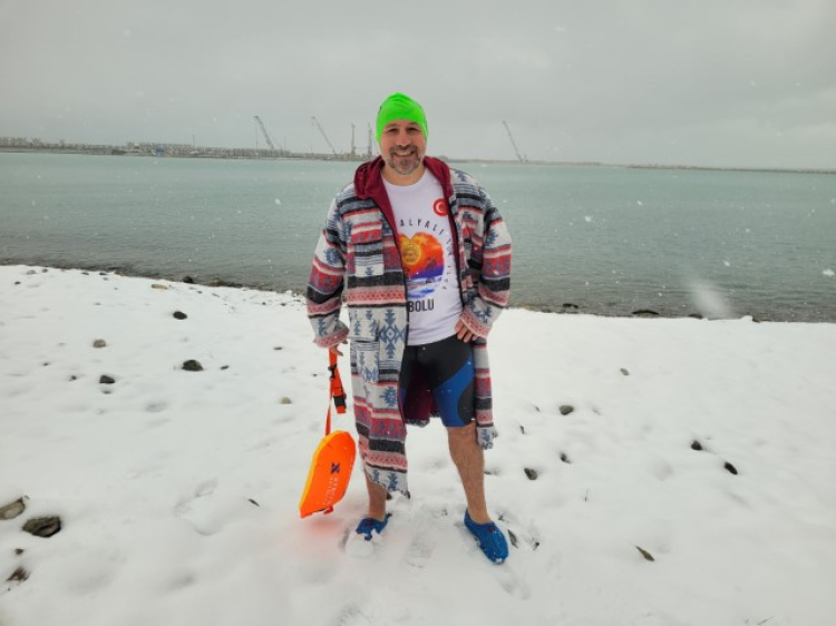 Soğuğa aldırış etmedi, kar altında denizde yüzdü