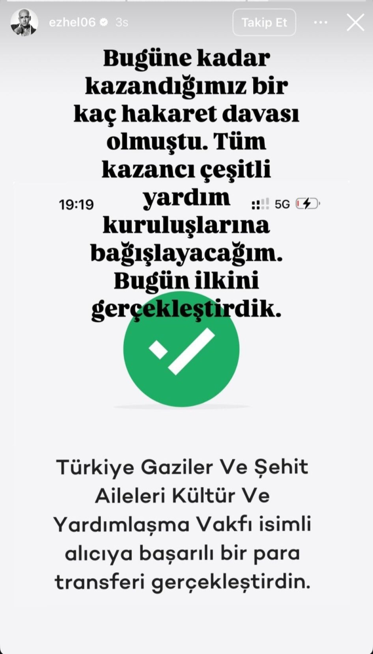 TÜGŞAV'dan yapılan açıklamada, "Ezhel ismiyle bilinen bir sanatçı kazandığı bir hakaret davasından aldığı tazminatı vakfımıza bağışlamıştır. Bölücü terör örgütüne destek açıklamalarıyla gündeme gelen ve Türkiye Cumhuriyeti devletine girişi yasak olan hiç kimseden bağış ve yardım kabul etmiyoruz.