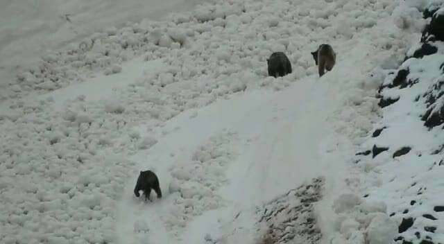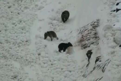 2 yavru ayı karda kayak keyfi yaşarken, anne boz ayı ise uzandığı kar kütlesinden pençeleriyle sağa sola kar atarken görüntülendi. Uzunca bir süre karda kayarak oynayan boz ayı ailesi daha sonra ormanlık alana doğru giderek gözden kayboldu.
