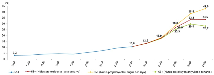 Yaşlı nüfus oranının 2030 yılında yüzde 13,5, 2040 yılında yüzde 17,9, 2060 yılında yüzde 27,0, 2080 yılında yüzde 33,4 ve 2100 yılında yüzde 33,6 olacağı öngörüldü.