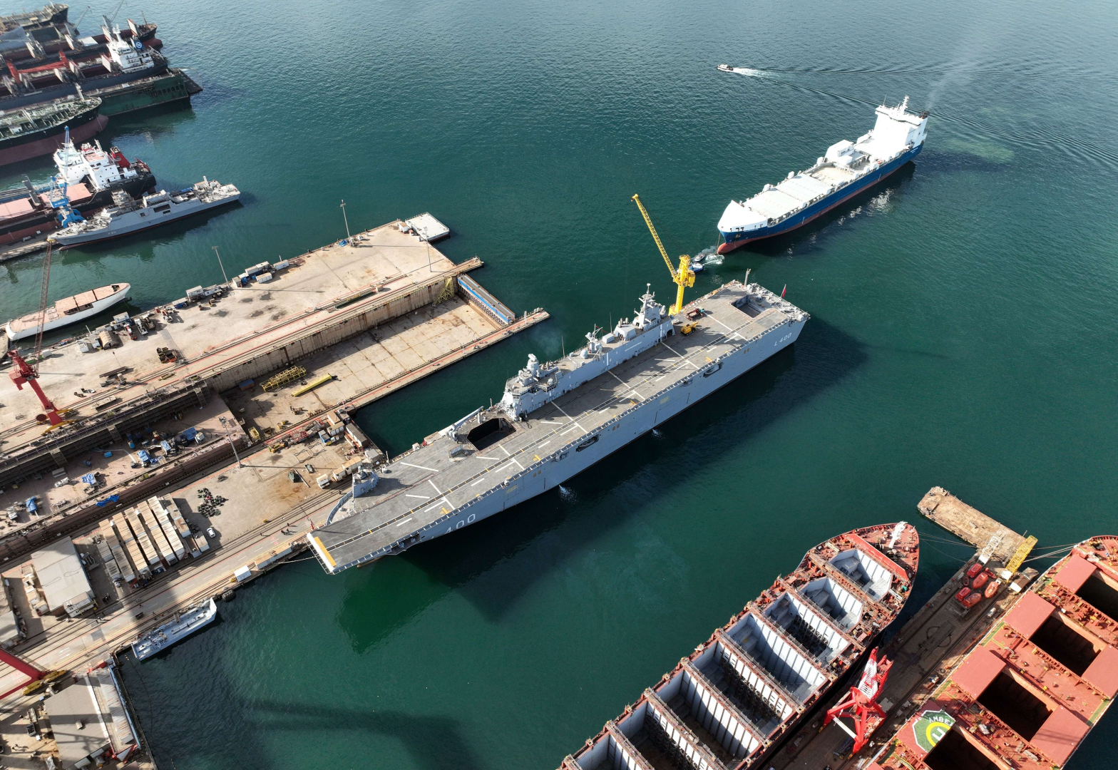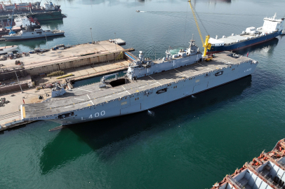 Türk Deniz Kuvvetleri’nin amiral gemisi olacak TCG Anadolu veya Anadolu L-400 isimli amfibik hücum gemisinin son durumu havadan görüntülendi. Büyük bir kısmı tamamlanan 232 metre genişliğindeki gemi tüm heybeti ile görenleri kendine hayran bırakıyor. TCG Anadolu ana yapılandırması bakımından Türkiye'nin amfibi hücum gemisi (LHD) sınıfına giren ilk gemi olma özelliğini taşıyor. 2014 yılında yapımına başlanan geminin çalışmalarında sona gelindi. TCG Anadolu tam donanımlı 8 helikopter bulundurabilecek. Geminin bir tabur tam teşekküllü askerin istenilen bölgeye sevkini sağlayabilme özelliği bulunuyor. Kıtalararası görevlere çıkabilecek elverişliliğe sahip olan geminin aktif olarak Mavi Vatan’ı koruması bekleniyor. 12 derecelik eğimi ile üzerinden savaş uçaklarının kalkışını kolaylaştıracak ve bu sayede helikopterler dışında uçakların kullanımında kolaylık sağlayacak rampa da eklenmiş. Gemide görev alması için ilerleyen zamanlarda kısa kalkış, dikey iniş yapabilen Lockheed Martin F-35B modeli veya farklı uçakların kullanılması planlanıyor. Toplam bin 400 kişiyi taşıyabilecek kapasitedeki gemi 700 kişilik amfibi gücü 8 deniz çıkarma aracını taşıyabiliyor. Gemi, içinde ameliyathane, diş tedavi üniteleri ve yoğun bakım ile enfeksiyon odalarının da bulunduğu en az 30 yatak kapasiteli askeri hastaneye de sahip olacak. BAYKAR Teknoloji Genel Müdürü Haluk Bayraktar, TCG Anadolu için dikey iniş kalkış ve konvansiyonel iniş kalkış yapabilen SİHA geliştirdiklerini ve bir yıl içerisinde hazır olacağını duyurmuştu.