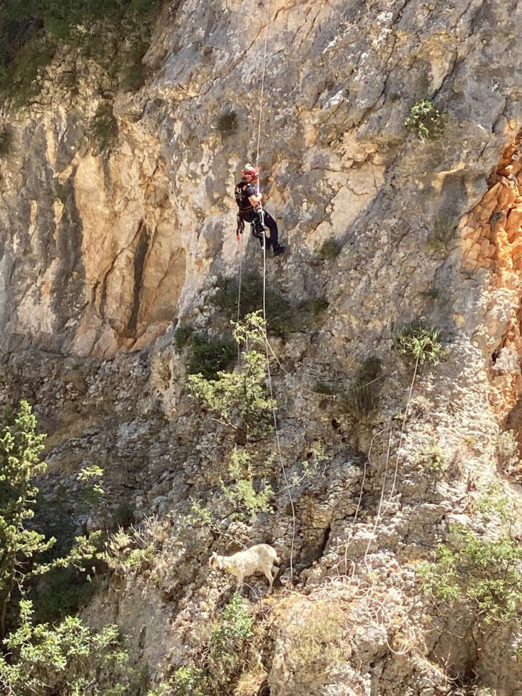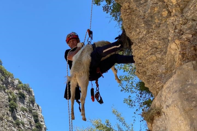 Mersin'in Erdemli ilçesinde 75 metrelik uçurumun 25. metresinde mahsur kalan keçi 5. günde kurtarıldı.