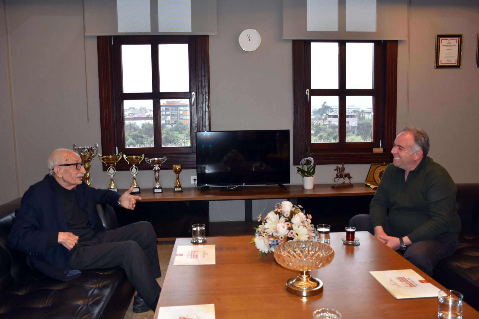 Türkiye'nin en geniş Atatürk fotoğrafları koleksiyoneri ve araştırmacı-yazar Hanri Benazus (93), Germencik Belediye Başkanı Fuat Öndeş’in daveti üzerine ilçeye geldi. Benazus’u ilk olarak makamında ağırlayan Öndeş ile sohbet eden Benazus daha sonra Mustafa Kemal Atatürk’ün Ege Manevrası sırasında tanıştığı Ortaklar Tren Garı'na geldi.