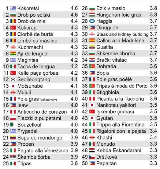 Otantik ve yöresel lezzetleri ülkeler arasında sıralamasıyla sık sık gündeme gelen dünyaca ünlü yemek eleştiri firması, son olarak dünya ülkelerinin sakatat yemeklerini puanladı. İçerisinde Türkiye ve Yunanistan’ın da olduğu listede Yunanistan 4.6 puan alan ‘kokoretsi’ ile birinciliği alan ülke oldu.