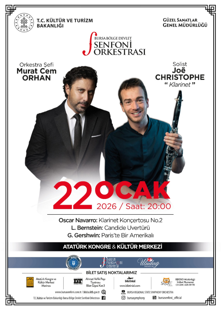 Bursa Bölge Devlet Senfoni Orkestrası (BBDSO), 22 Ocak 2026 Perşembe akşamı dünyaca ünlü Fransız klarnet virtüözü Joë Christophe ve şef Murat Cem Orhan’ı ağırlamaya hazırlanıyor.