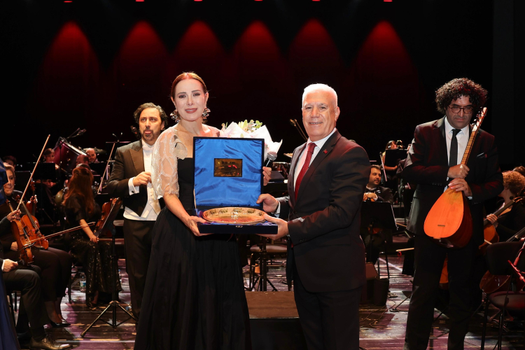 Konserin sonunda Başkan Mustafa Bozbey ve eşi Seden Bozbey sahne çıkarak, günün anısına sanatçılara çiçek ve İznik çinisi tablo takdim etti.