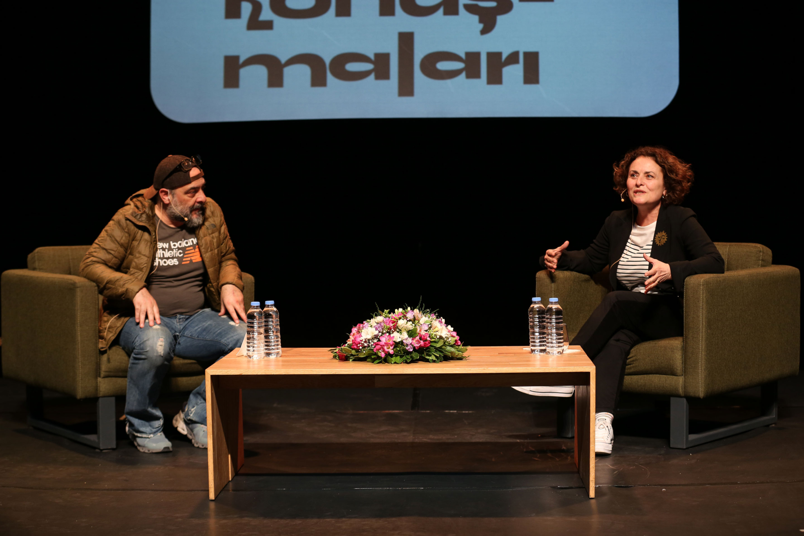 Tiyatro Konuşmaları’nın ikinci oturumunda, Murat Daltaban ile Nazlı Ökten, “Dünyanın Trajedisi” konusunu üzerine söyleşti. Bir oyuncu ve sanatçı olarak yaşanan deprem felaketleri sonrası hislerini ve yaşadıklarını paylaşan Murat Daltaban, sanatın dinamik, değişken ve insanın birbiriyle, doğayla ilişkisinde ne kadar kıymetli olduğunu daha yoğun hissetmeye başladığını belirtti. “Bazı şeyleri hissetseniz de, bilmiyorsunuz” diyen Murat Daltaban, “Bilmek için cümleye dökmek, okumak, üzerine düşünmek, onları belli bir formda hayatınızda tecrübe etmeniz gerekiyor” ifadelerini kullandı. Yaşanan deprem felaketi sonrasındaki dayanışmanın, motivasyona dönüştüğünü söyleyen Daltaban, “Birbiriyle omuz omuza felakete karşı göğüs germe haline dönüştü. Merhamete ihtiyacımız vardı. Bir araya gelip, bir arada olmanın yarattığı enerjinin bizi güven kozası içinde kaplaması ve o güvenin getirdiği hayata tutunabilme gücü yaratması. İşte belki de sanat, özellikle de tiyatro, benim baktığım pencereden tam da budur” dedi.