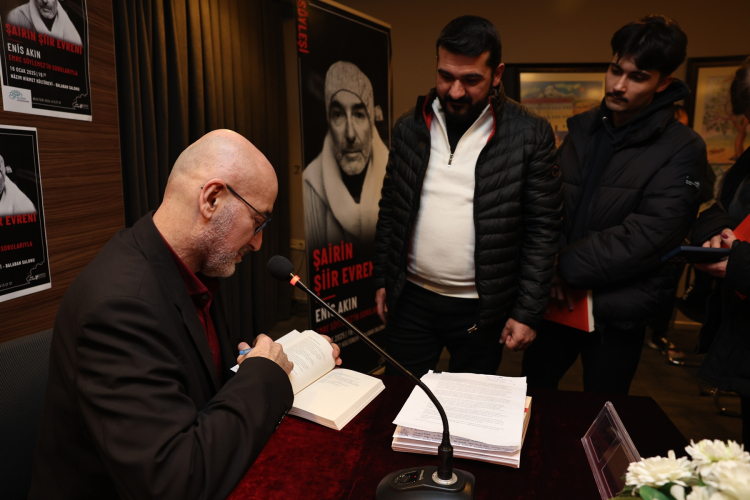 ve kültürünü geliştirmek amacıyla sürdürdüğü ‘Şairin Şiir Evreni’ söyleşisinde, kıymetli isimleri ağırlamaya devam ediyor. Programın 2025 yılının ilk konuğu ise deneyimli yazar Enis Akın oldu. Nazım Hikmet Kültürevi Balaban Salonu’nda gerçekleştirilen etkinliğin moderatörlüğünü de genç Yazar Emre Söylemez yaptı. Enis Akın; eğitim hayatı, yaşamı, yazmaya başlama serüveni ve şiirleriyle ilgili açıklamalarıyla renkli bir söyleşi gerçekleştirdi. ‘Arada olma’ kavramının kendisini beslediğini söyleyen Enis Akın, Aksaray’da doğup Laleli’de büyümenin, Avrupa ile Asya arasında yer alan bir ülkede yaşamanın, Türkiye’de yaşayanların sahip olduğu farklı kimlikler ve ekonomik farklılıkların, bu kavramı destekleyen unsurlardan bazıları olduğunu belirtti. Ailesinin ekonomik olarak alt gelir grubunda yer aldığını anlatan Akın, ekonomik durumu iyi olan çocukların eğitim aldığı bir okulda okuduğunu da paylaştı. Okul hayatında başarılı bir öğrenci olmadığını ifade eden Akın, kendisini hayat okulunda başarılı olmaya adadığını aktardı.