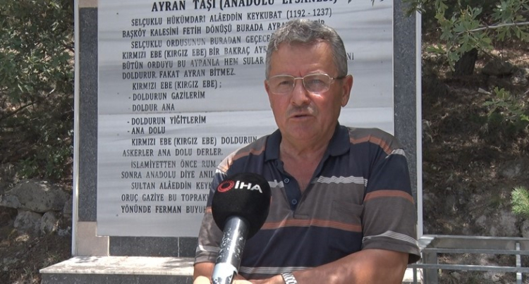 Taşlıca köyü sakinlerinden Ali İhsan Gökmen, Kırmızı Ebe ve Anadolu hikayesini anlatarak, “Ayran taşının kısaca hikayesi Kırmızı Ebe'yle bağlantılıdır. Alaeddin Keykubat döneminde 1220-1237 yılları arasında vuku bulan bir hadise bu. Alaeddin Keykubat fetihten bu buraya gelirken burada mola veriyor bugünkü gibi bir sıcakta. Bu sırada Kırmızı Ebe elinde bir bakraç ayranla geliyor ve bu gördüğümüz ayran taşına bir bakraç ayranı boşaltıyor. Bunu gören askerler ayran taşının yanına gelip susuzluklarını gideriyor. Fakat bu sırda da ayran bitmiyor. Önce doldur ana diye nida eden askerler daha sonra ayranın bitmediğini görünce ‘ana dolu' diyorlar. Bu topraklara Anadolu verilmesi bundan kaynaklanıyor. Bunu gören Alaeddin Keykubat Kırmızı Ebe'ye ‘benden ne dilersin' diye soruyor. Kırmızı Ebe'de ‘sırtımdaki yavrumun iyi bir eğitim almasını ve bu bölgeden vergi alınmamasını istiyor. Alaeddin Keykubad bu dileğe karşılık bu bölgedeki toprakları Kırmızı Ebe'ye vakıf ediyor” şeklinde konuştu.