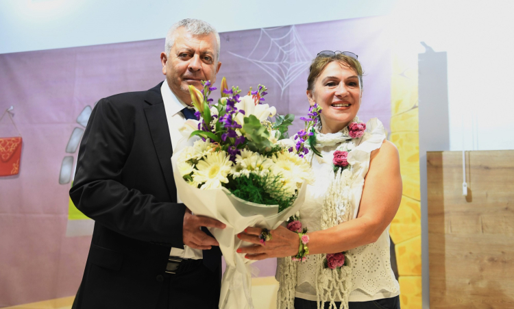Söyleşinin sonunda Osmangazi Belediye Başkan Yardımcısı Mutlu Esendemir, yazar Halime Yıldız’a çiçek takdim etti.