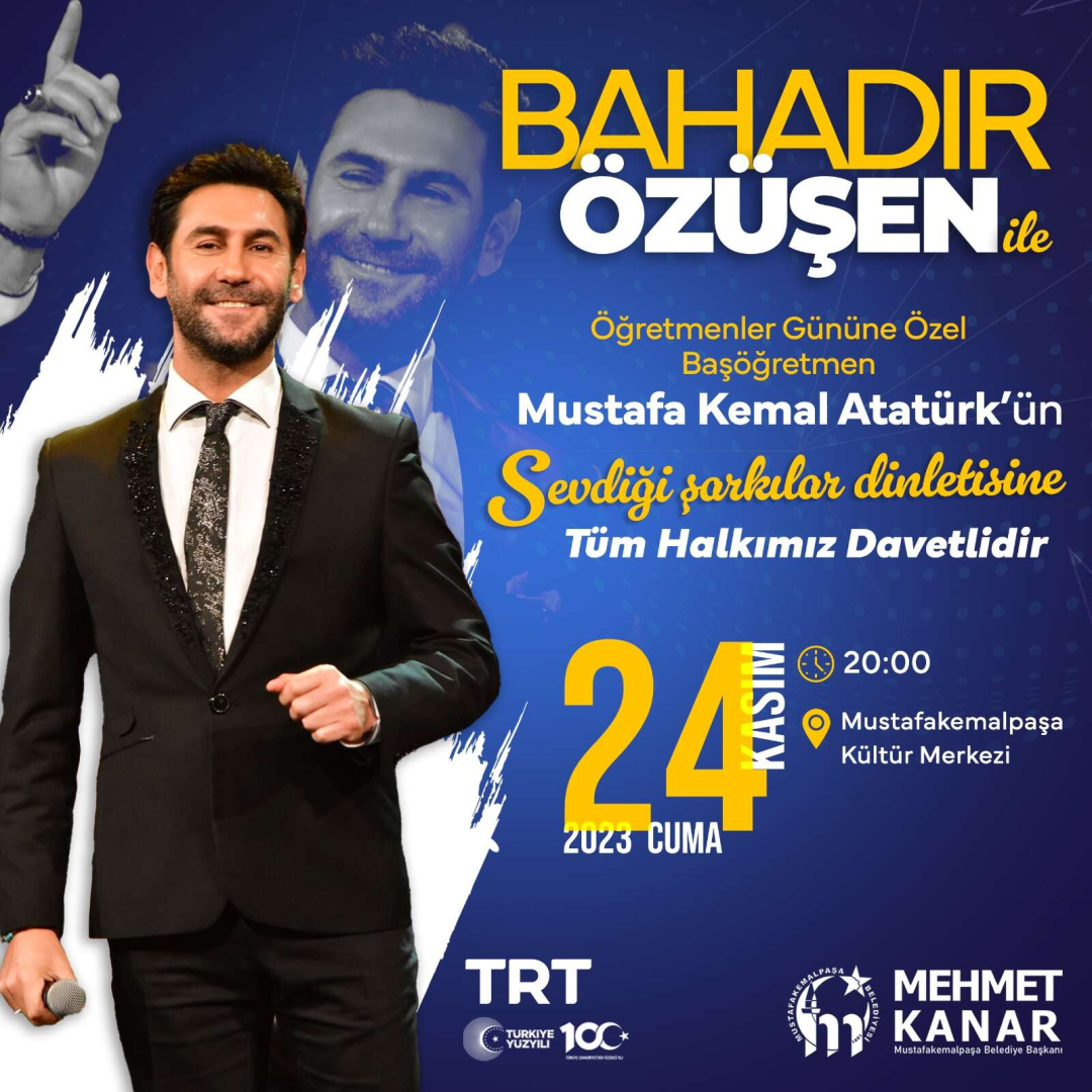 24 Kasım Cuma Günü TRT Ankara Radyosu Ses Sanatçılarından Bahadır Özüşen’in yorumuyla Büyük Önder Mustafa Kemal Atatürk’ün Millet Mekteplerinin kendisine verdiği ‘’ Başöğretmen’’ unvanını kabul etmesinin yıl dönümünü olan Öğretmenler Gününe Özel Başöğretmen Mustafa Kemal Atatürk'ün sevdiği şarkılar müzik dinletisi saat 20:00’da Büyük Salonda gerçekleşecek.