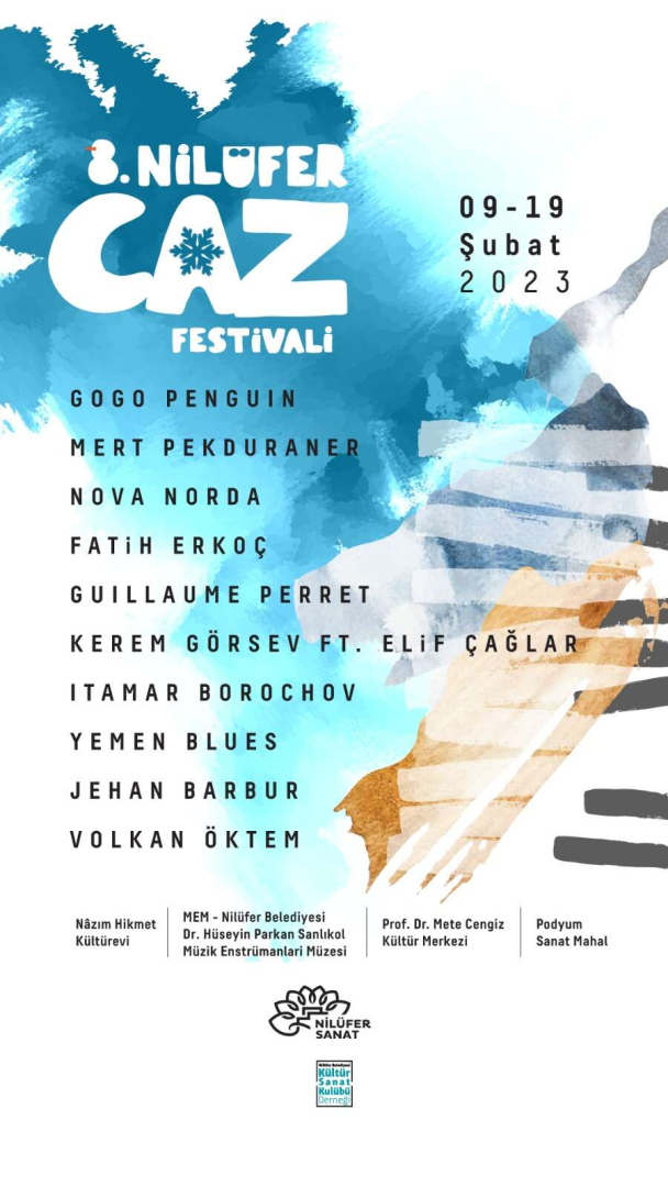 Avrupa Caz Ağı (European Jazz Network) üyesi olan Nilüfer Caz Festivali, bu sene uluslararası sanatçıları ağırlamanın yanı sıra, Festival tarihlerine denk gelen 14 Şubat Sevgililer Günü’ne özel olarak gerçekleşecek olan konserde, geleneksel cazın ülkemizdeki en önemli temsilcilerinden olan Kerem Görsev, Elif Çağlar’ın eşsiz sesiyle müzikseverlerle buluşacak. İkiliye kontrbasta Volkan Hürsever, davulda Ferit Odman eşlik edecek. Orta Doğu kökenlerini caz dörtlüsü formatıyla birleştirip kendine özgü bir hikayeler yaratarak ortaya büyüleyici egzotik motifler çıkaran çok kültürlü müziğiyle Itamar Borochov tüm şehri etkisine alacak performansıyla bir müzik ziyafeti vaat ederken, 2010 yılında besteci ve müzisyen Ravid Kahalani tarafından her üyenin farklı bir geçmişten geldiği özgün bir ekip olarak kurulan Yemen Blues katılımcıları eşsiz bir canlı performans deneyimine davet ediyor.