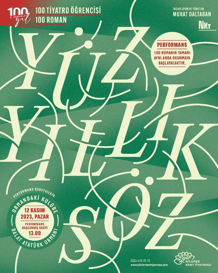 Nilüfer Belediyesi Cumhuriyetin 100. Yıl kutlamalarına hız kesmeden devam ediyor. Nilüfer Kent Tiyatrosu, Genel Sanat Yönetmeni Murat Daltaban tarafından tasarlanan ve yönetilen “yüz yıllık SÖZ” isimli canlı okuma performansı, Cumhuriyet döneminde yazılmış romanlardan seçilen 100 Romanın, Türkiye’nin tüm tiyatro okulları ve konservatuvarlarından davet edilen 100 tiyatro öğrencisi tarafından bir gün içinde, tek bir solukta okunmasıyla gerçekleşecek.