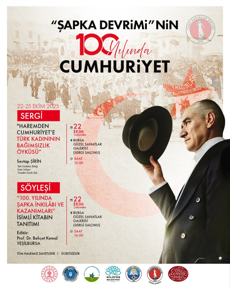 Türk Kadınlar Birliği Bursa Şubesi, Şapka Devrimi'nin 100. yılı ve Cumhuriyet'in 102. yılı anısına sergi ve söyleşi düzenliyor. 22-25 Ekim 2025'te Bursa Güzel Sanatlar Galerisi'nde gerçekleşecek etkinliklerin ilk gününde "Haremden Cumhuriyet'e Türk Kadını" sergisi açılacak.