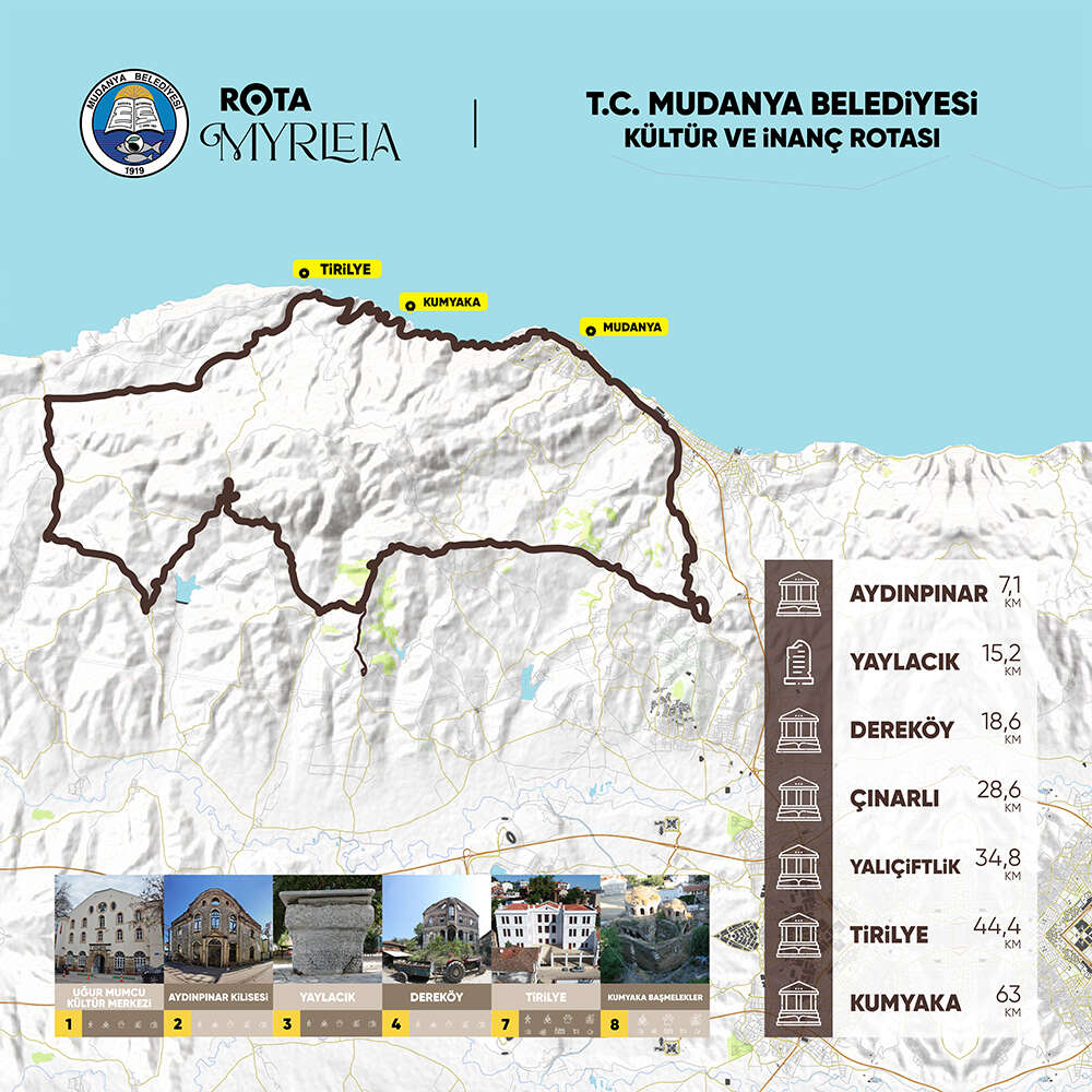 Mudanya Belediyesi’nin ilçenin doğal, tarihi ve kültürel zenginliklerini tanıtmak için “Rota Myrleia” adı altında çalışmalarını tamamladığı “İnanç, Yürüyüş, Bisiklet ve Trekking” rotaları, Bursa Valiliği’nin oluru ile kültürel amaçlı rota ilan edildi. 2700 yıllık bir geçmişe sahip olan Mudanya’nın tarihi, kültürel ve doğal değerlerini kapsayan 131,6 kilometrelik kültür rotası, Turizm Amaçlı Sportif Yönetmeliği gereğince turizme kazandırıldı.