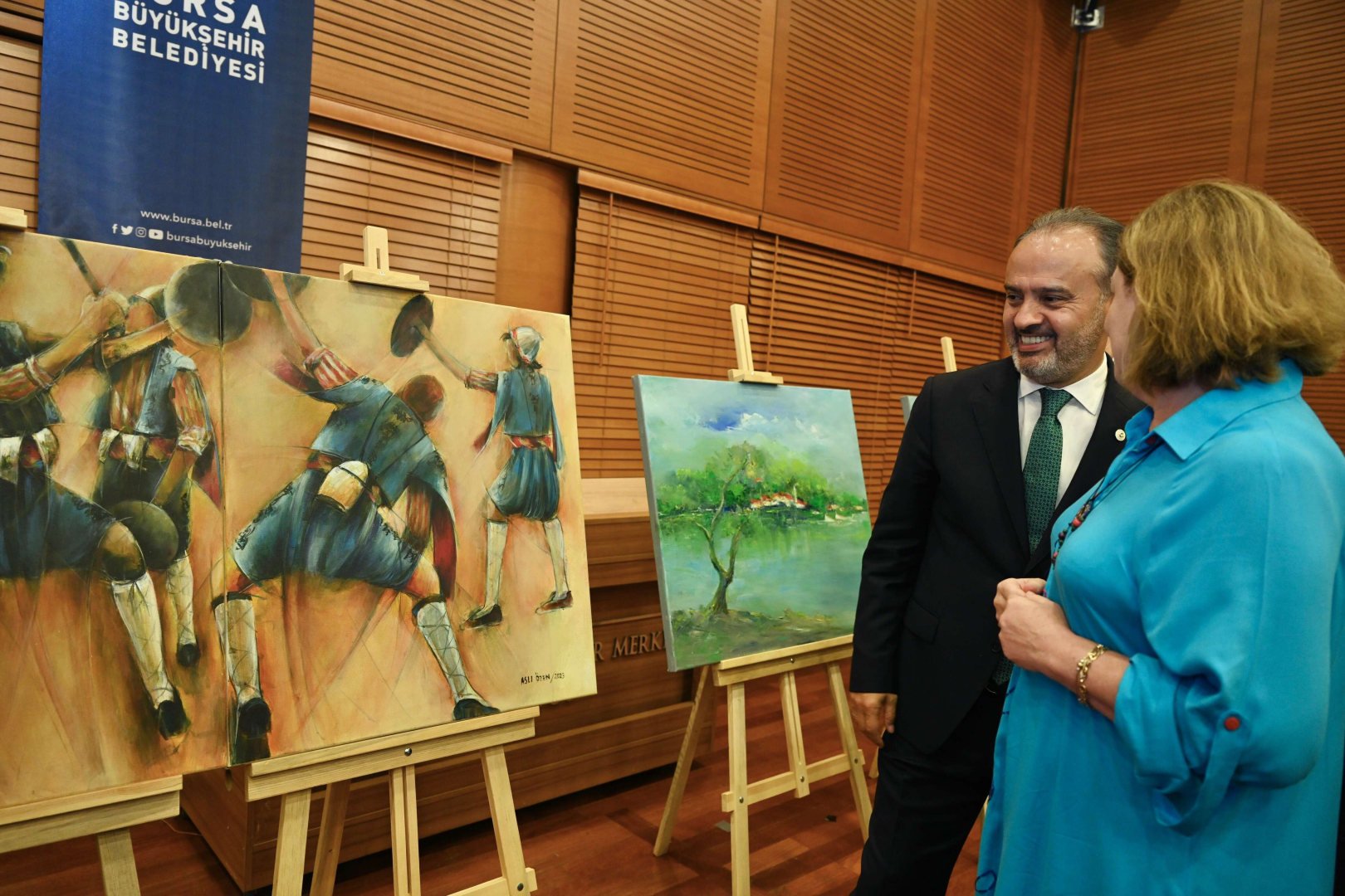 Atatürk Kongre ve Kültür Merkezi Hüdavendigar Salonu’nun fuaye alanındaki serginin açılış törenine katılan Bursa Büyükşehir Belediyesi Başkanı Alinur Aktaş, Bursa’ya önemli bir değer olarak kalacak eserlere imza atan tüm ressamlara teşekkür etti. Her şehrin bir hikayesi olduğunu, Bursa’nın hikayesinin ise belki de en orijinal hikayelerden biri olduğunu kaydeden Başkan Aktaş, “Bursa beş farklı medeniyete ev sahipliği yapmış, özellikle erken dönem Osmanlı'nın eserlerini bağrında barındıran ve çok önemli izlerini hala taşıyan bir şehir. Burada açıkçası ressamlarımızın eserlerine baktığımızda da bunu çok net görmek mümkün. Ben her bir sanatçımıza teşekkür ediyorum. Bu çalışmalar ne benim şahsıma ve ne de bir başka kişiye ait çalışmalar. Bunlar Bursa'nın çalışmaları, Bursa'ya değer olarak kalacak çalışmalar. Dolayısıyla şehir dışından, yurt dışından gelen misafirlerimiz var. Her birine ayrı ayrı teşekkür ediyorum. Yüreklerine sağlık” dedi.