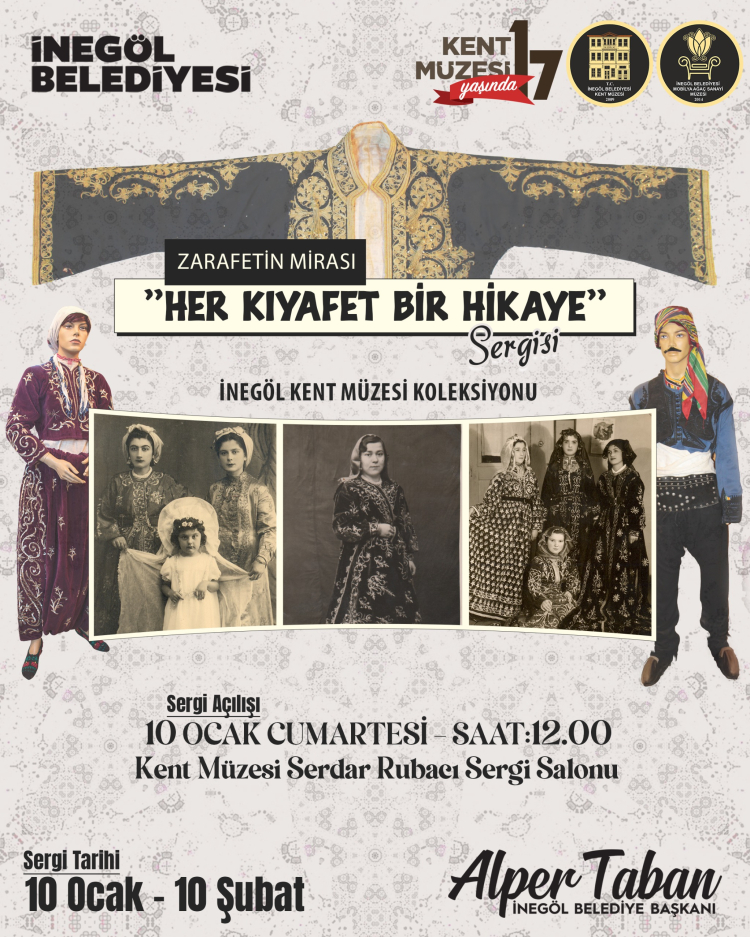 İnegöl Kent Müzesi’nin kuruluşunun 17’nci yılı özel bir sergiyle kutlanacak. “Zarafetin Mirası - Her Kıyafet Bir Hikaye” isimli sergi, 10 Ocak Cumartesi günü saat 12.00’de düzenlenecek açılışla ziyaretçileriyle buluşacak.