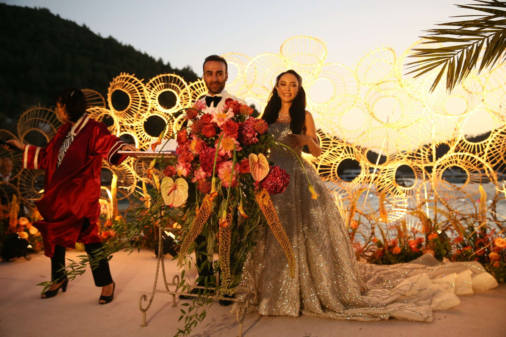 Bodrum'da düzenlenen bir düğünde gelin için Hindistan'da hazırlanan 3 milyon lira değerinde, 65 kilo ağırlığında, komple Swarovski taşlarla işlenerek Türkiye'ye getirilen gelinlik göz kamaştırırken, gelinliği 45 kilo olan gelin taşıdı.