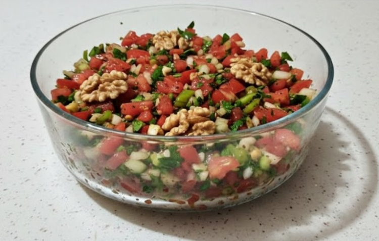 Hazırlanışı: Tüm sebzeleri klasik "çoban salata" usulü ince ince doğrayın. Üzerine zeytinyağı, limon ve nar ekşisi gezdirin. Servis tabağına aldıktan sonra üzerine iri kırılmış cevizleri serpiştirin.