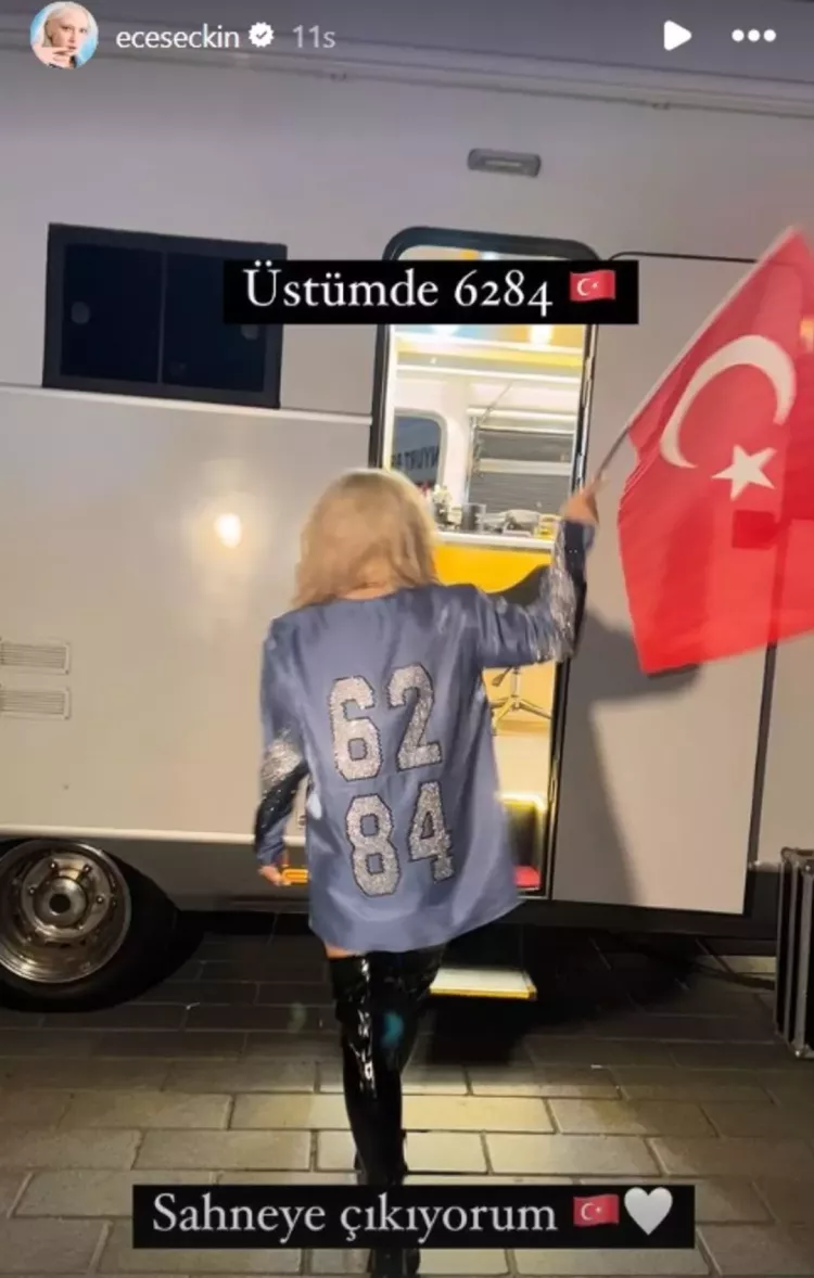 Seçkin, mini ışıltılı elbisesi ile dikkat çekerken ünlü ismin elbisesinin arkasındaki rakamlar ile 6284 nolu Kadına Karşı Şiddetin önlenmesine dair yasaya vurgu yapması takdir edildi.
