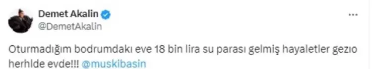 Ünlü şarkıcı 'Oturmadığım Bodrum'daki eve 18 bin TL su parası gelmiş, hayaletler geziyor herhalde evde' ifadeleri kullanıp MUSKİ Genel Müdürlüğü'nü etiketledi.
