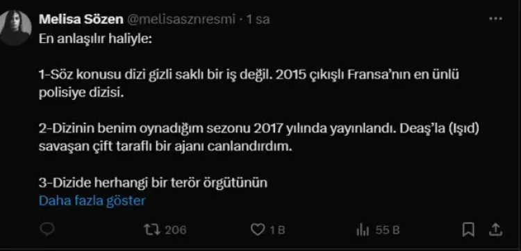 Dizide Esrin isimli bir ajanı canlandıran Melisa Sözen en sonunda uzun bir açıklama yaptı. Melisa Sözen "En anlaşılır haliyle" diyerek şunları söyledi: