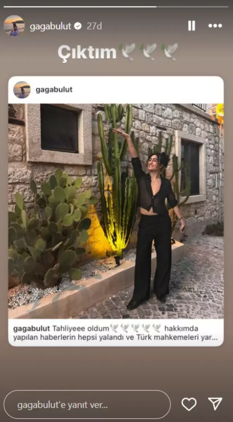 Serbest bırakıldığını takipçilerine aktaran Gaga Bulut "Ömrümden giden 2 ayın yerini dolduramam" dedi.