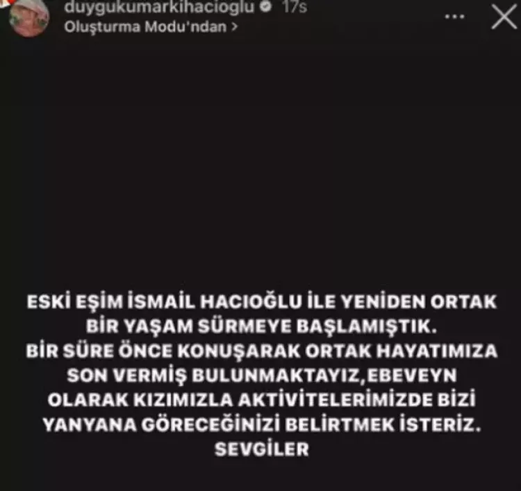 Oyuncu İsmail Hacıoğlu, 2015 yılında anlaşmalı boşandığı eşi Duygu Kumarki ile ocak ayında barıştı. İkili, 2024 yılını birlikte karşılamıştı. Ancak bu ilişki uzun sürmedi. Eski eşten ayrılık açıklaması geldi.