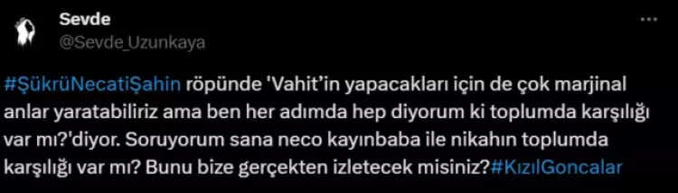 Özgü Namal ve Özcan Deniz'in başrolü paylaştığı Kızıl Goncalar, yeni bölümünden önce yayınladığı fragmanlarla ortalığı karıştırdı. Son yayınlanan fragmanda gelinlik giyen Zeynep'in Vahit'le evlendirildiği görüldü. Bu sahne hem kafaları karıştırdı hem de tepkiye yol açtı.