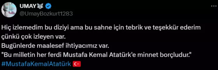 Sıla Türkoğlu, Doğukan Güngör, Evrim Alasya, Ahmet Mümtaz Taylan yer aldığı Kızılcık Şerbeti'nin yeni bölümünde Atatürk sahnesi diziye damga vurdu. Haluk isimli çalışan Atatürk'ten rahatsız olunca Ömer ağzının payını verdi. O sahneye yorum yağdı.
