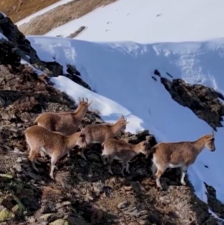 Erzincan-Tunceli sınırındaki Munzur Dağları'nda koruma altındaki dağ keçileri, karlı arazide yiyecek ararken drone ile görüntülendi. Nesli tükenme tehlikesi altındaki keçiler belgesel niteliğinde çekimlerle doğaseverleri sevindirdi.