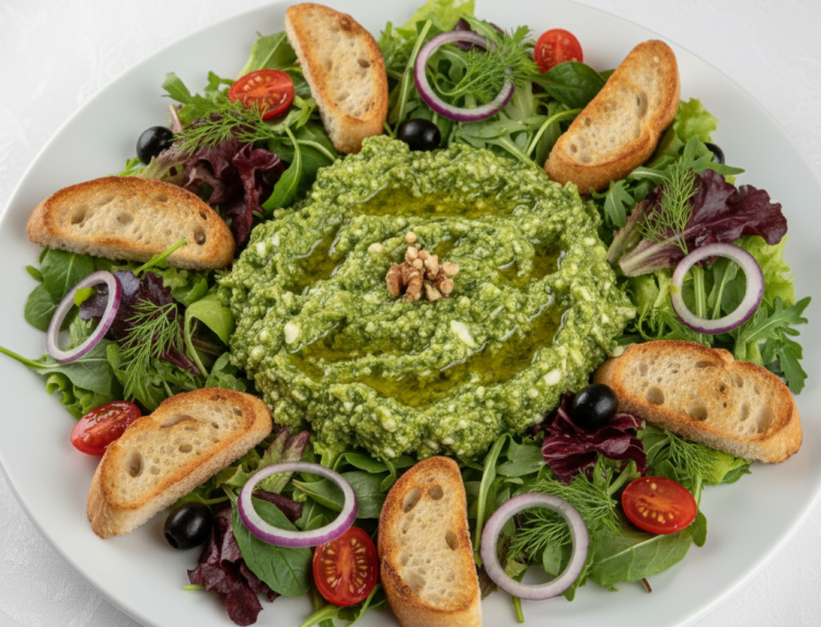 Karışımı servis tabağına alın, üzerine pul biber serpin ve ceviz içiyle süsleyerek servis yapın.