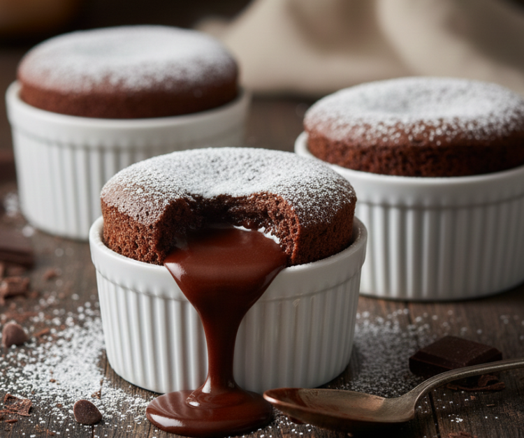 Önceden ısıtılmış 200°C fırında tam 8 ila 12 dakika pişirin. (Kenarları pişip ortası akışkan kalmalı). Fırından çıkar çıkmaz dondurma veya pudra şekeri ile sıcak servis yapın!