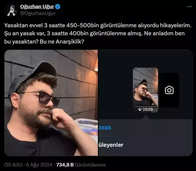 Oğuzhan Uğur bir paylaşım yaparak "Yasaktan evvel 3 saatte 450-500 bin görüntülenme alıyordu hikâyelerim. Şu an yasak var, 3 saatte 400 bin görüntülenme almış. Ne anladım ben bu yasaktan? Bu ne anarşiklik?" açıklamalarında bulundu.
