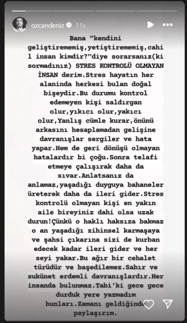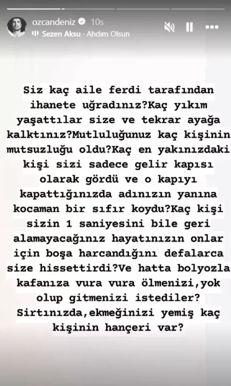 Özcan Deniz ise dün gece yarısı Alaçatı sahnesinin ardından yılların birikimiyle peş peşe duygusal paylaşımlar yaptı ve Sezen Aksu’nun Ahdım Olsun şarkısı eşiliğinde ailesiyle bağlarını kopardığını, artık tek ailesinin oğlu Kuzey ve eşi Samar Dadgar olduğunu ifade etti.