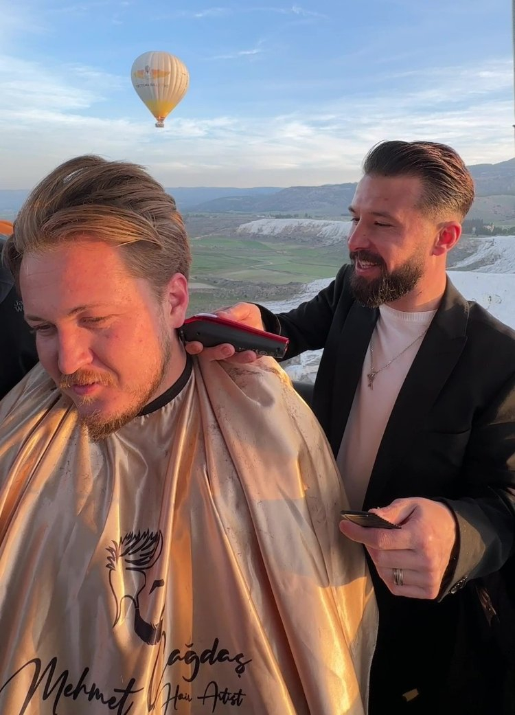 Denizlili Kuaför Mehmet Çağdaş, sıra dışı bir etkinliğe imza attı. Müşterisini yerden 300 metre yükseklikten Pamukkale’yi izlerken tıraş eden Çağdaş, balondaki yerli ve yabancı turistler tarafından ilgiyle izledi.