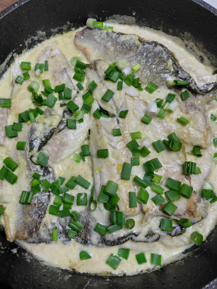 Malzemeler: 4 adet levrek fileto, 1 paket sıvı krema, 2 diş sarımsak, taze soğan, zeytinyağı, tuz ve karabiber.