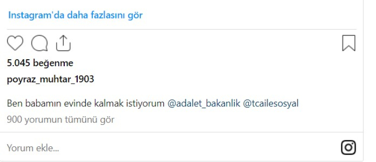 Deniz Uğur ve Reha Muhtar'ın oğlu bu paylaşımı "Ben babamın evinde kalmak istiyorum" notuyla paylaşarak Aile ve Sosyal Politikalar Bakanlığı ve Adalet Bakanlığını mantionladığı görüldü.